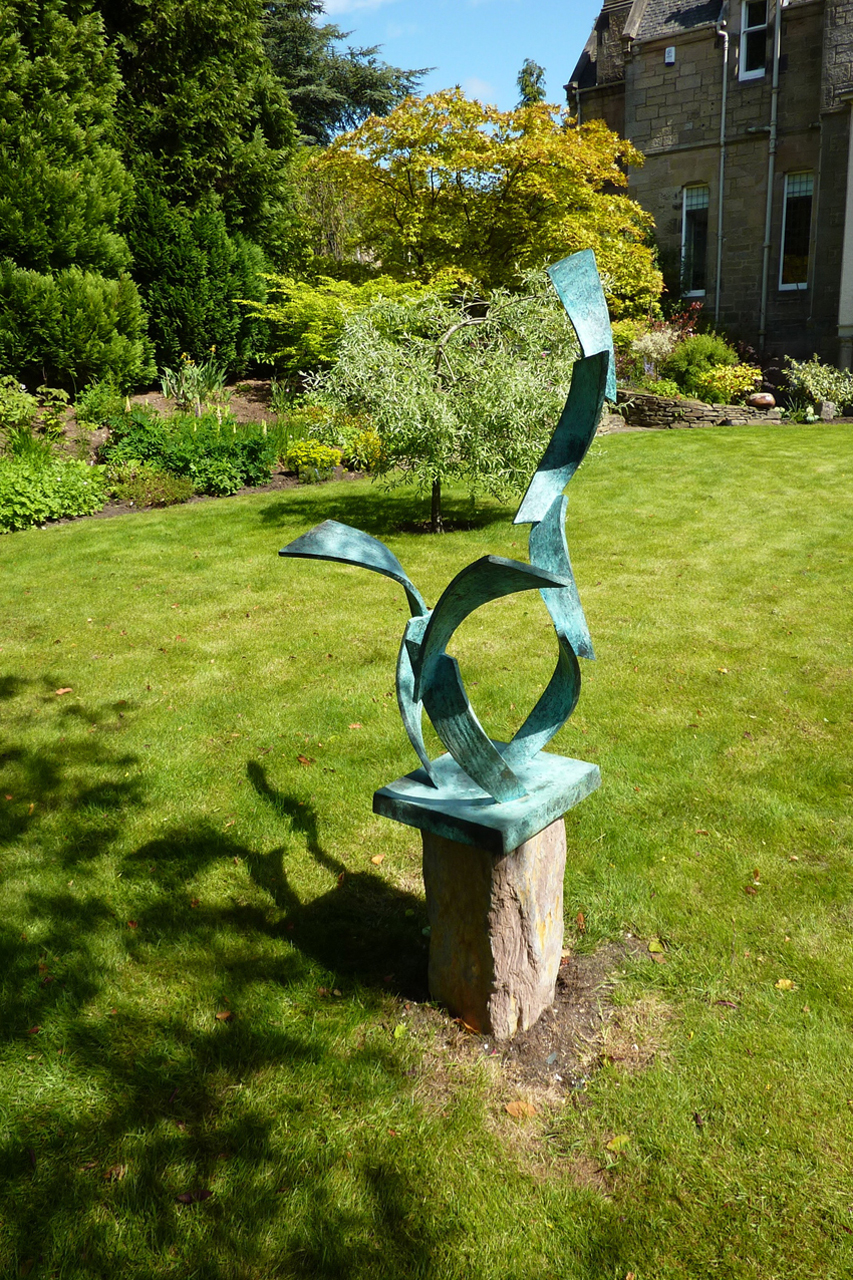The title Per Ardua is from the Latin, 'Per Ardua Ad Astra', meaning reaching for the stars; striving for higher things and beyond through adversity. The bronze sculpture is the result of observations of the graceful and rhythmic movement of salmon leaping at Buchanty Spout, River Almond, to spawn upstream.