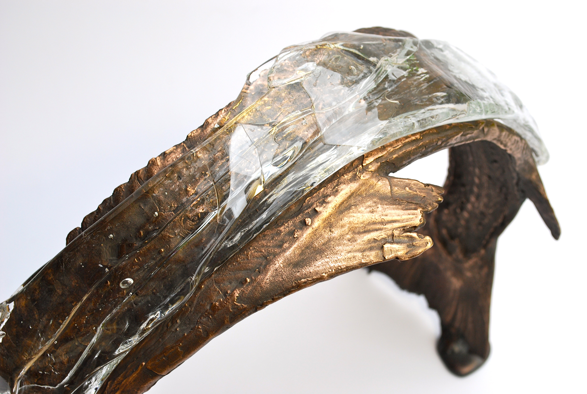 The bronze and glass sculpture Second Skin II explores the development of fish immunology. The idea is to create a new protective ‘skin’ for the farmed salmon. The sculpture is made from pouring molten glass directly onto the bronze. Through this new glass layer, the bronze internal bone structure is visible.