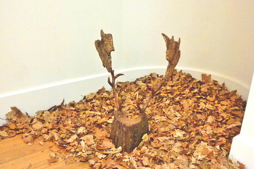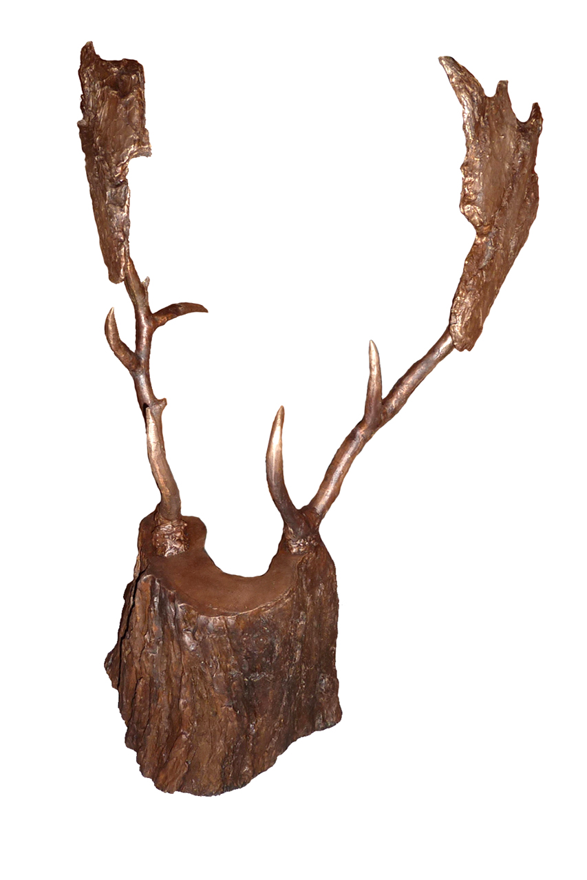 The bronze sculpture The Trophy is a cast of tree bark and branches in the shape of a set of fallow deer antlers. It is installed in a bed of fallen leaves from the woodland as a reminder of the deer’s habitat. The form of the traditional trophy-display antlers combined with the natural woodland materials recall the tension between the material motivations for stalking – hunting for trophies – and environmental ones – culling.